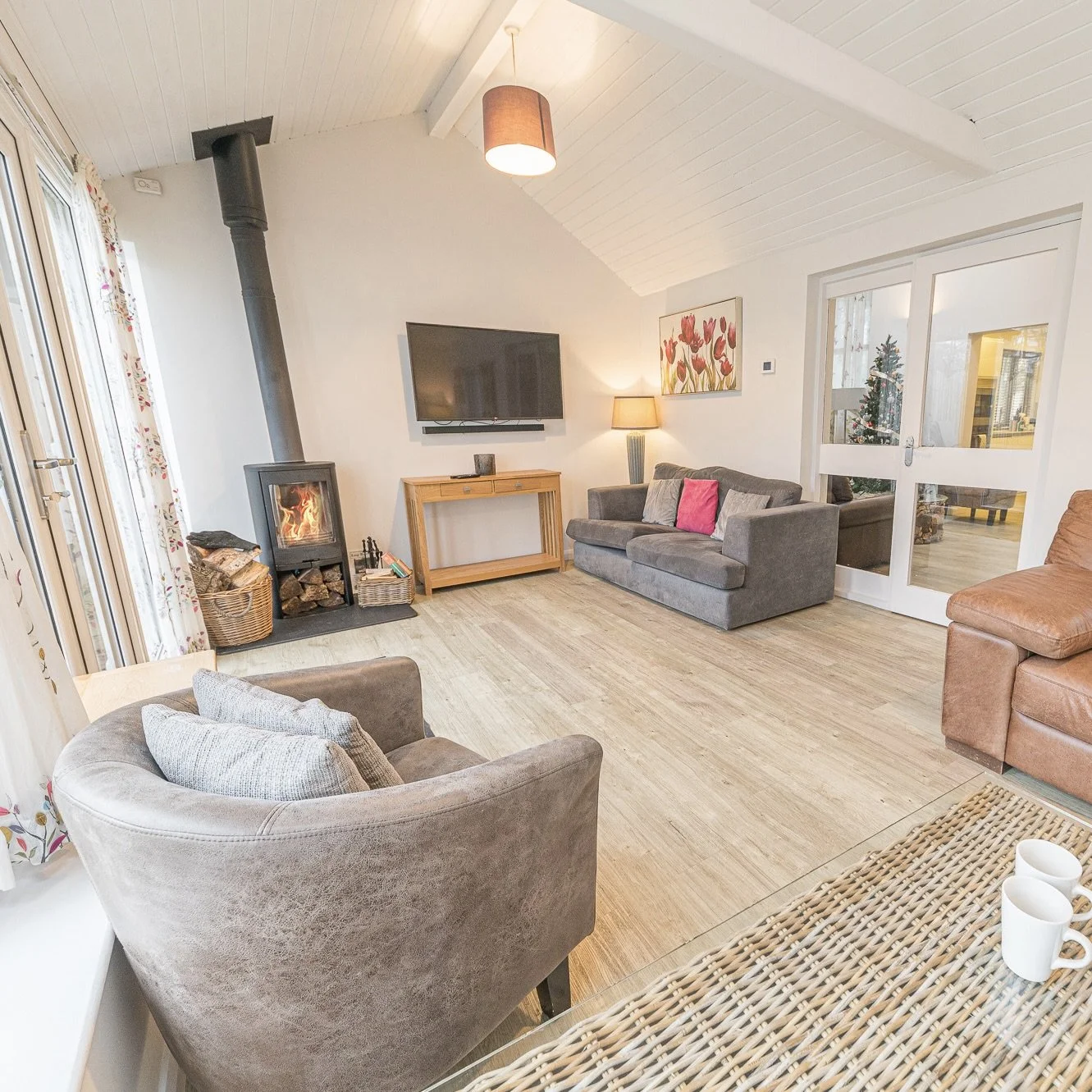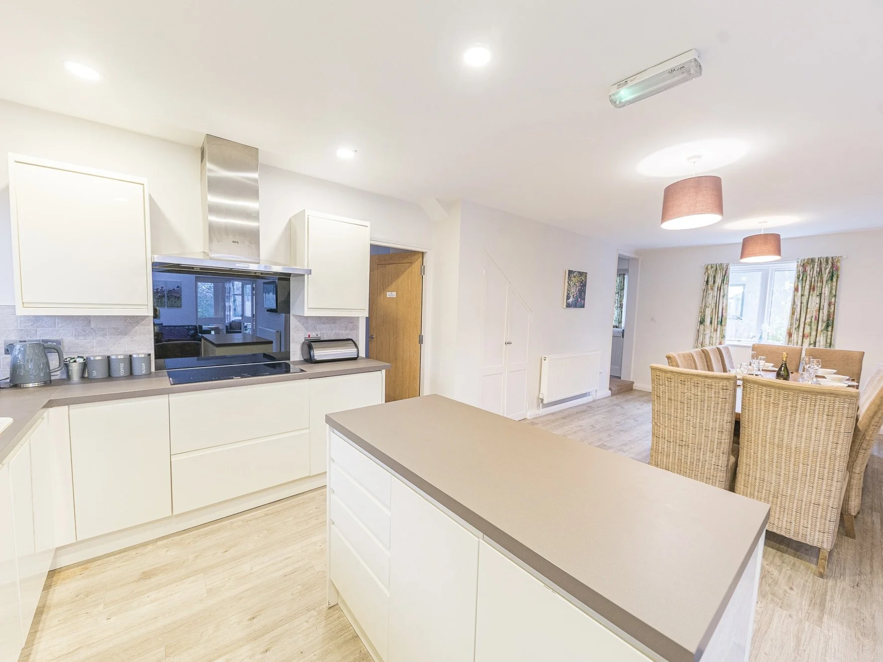 The cottage welcomes guests with a bright and inviting entrance that leads into a spacious open-plan living area. The high-quality kitchen, dining area seating 12, and lounge with wall-mounted TV create the perfect space for entertaining and socialising.
